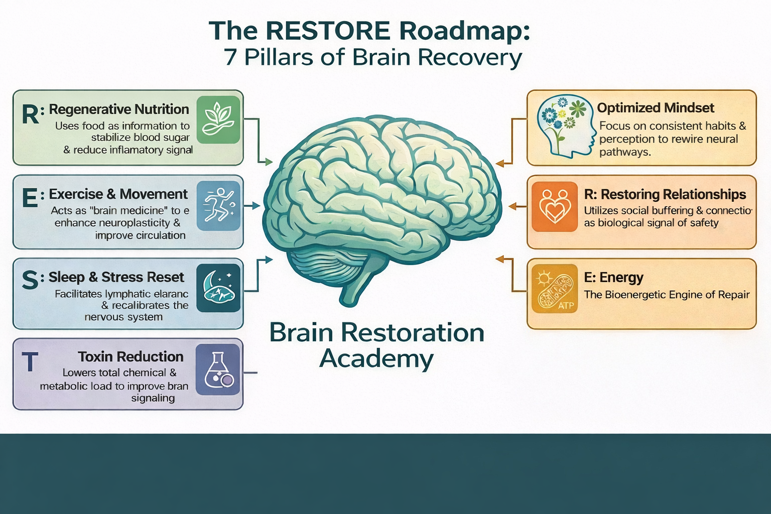 Learning at the Brain Restoration Academy begins with the RESTORE™ Framework, the foundational course that introduces the seven pillars of brain restoration.
